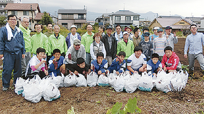 中RCと西中学校の特別支援級の生徒、市内で障害者支援事業を行っている(株)秦野インクルージョンの利用者らが10月28日、平沢の農園でさつまいもを収穫した。5月に自分たちで植えた苗が、丸まると大きく育ち約40人の参加者は笑顔で芋を掘り出していた。