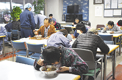 入所・通所者らは食堂でそばかうどんを選び注文。夢中になって食べる姿が見られた。松下園を運営する社会福祉法人寿徳会の久保谷勤理事長は「近年は地域との交流に力を入れている。こうして地元の飲食店組合が、いつものご飯とは違う料理を振る舞ってくれることがありがたい」と話す。川口組合長は「毎年続けていると、覚えてくれている人もいる。それが嬉しいですね」と話した。