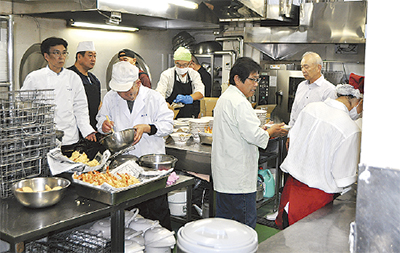 同組合は「年越しそばを味わってもらおう」と松下園の開設当初から30年以上に渡って続けている。現在はひと足早く11月に実施しており、当日は役員8人が松下園を訪れ、厨房で海老の天ぷらそば・うどんを160食用意した。