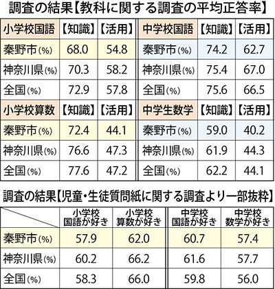 今回明らかになった結果によると、小中学校とも両教科で全国平均をわずかながら下回った。秦野市ではこれまでの同調査で平均が全国平均を上回ったことはない。市教育委員会も「小・中学校ともに国語では自分の考えを書く分野や、小学校算数では、式の意味を記述する分野、中学校数学では、反比例の特徴をとらえ、変化の様子を記述する分野などについて課題がある」と指摘する。
