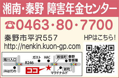 「障害年金について気軽に相談できる場所を作りたい」と11月末に『湘南・秦野障害年金センター』(栗原和子所長/クオン社会保険労務士法人内)を開設。4人の専門家が随時、電話やホームページで無料相談を受け付けている。精神や身体の不調で仕事や生活に支障が出て困っている…という人は、障害年金を受給できるか、まずは一度相談してみては。