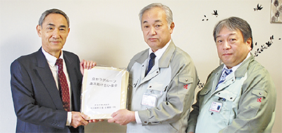京セラ(株)神奈川秦野工場の西原佳昭工場長らが12月26日、秦野市社会福祉協議会(藤村和靜会長)を訪れ、「京セラグループ歳末助け合い募金」として集めた27万9298円をはだの福祉基金に寄付した。12月初旬に174人の従業員に呼びかけ寄せられた募金に、会社と組合からの金額を加えたものだ。