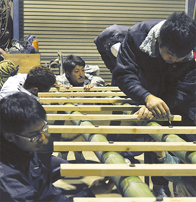 新春の恒例行事となっている「消防出初式」が今年も1月14日(土)にカルチャーパーク第3駐車場で開催される。迫力ある鳶職人の「はしご乗り」に使われるはしごの製作が昨年12月23日、森谷建設(森谷保夫代表)で行われた。