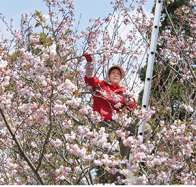 千村の桜花農家、小野孝允さん(71)は「80歳を超えたら、はしごには登るのは難しく、10年先は自分も今のように花をもげるか分からない。毎年手伝いに来てくれる人がいれば助かる農家も多いはず」と話す。