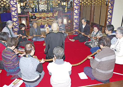 この日、本堂に集まったのは檀家ら13人。竹石住職が南無阿弥陀仏と108回唱える間の約5分間、時計と反対周りに数珠を回していった。百瀬さんも参加して「数珠も喜んでいるようだった」と笑顔で話した。