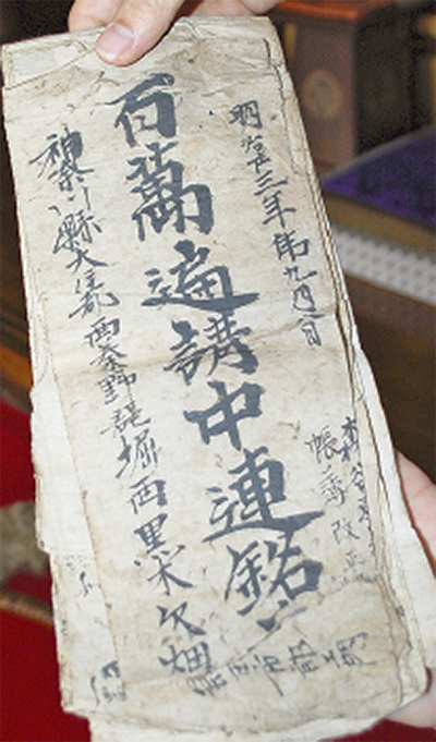 大数珠が納められていた木箱には、「相州大住郡堀黒木大日堂什物」「安政四巳八月三日」と刻まれた鉦や、「明治廿三年」という文字や参加者の氏名が書かれた紙束なども入っていた。