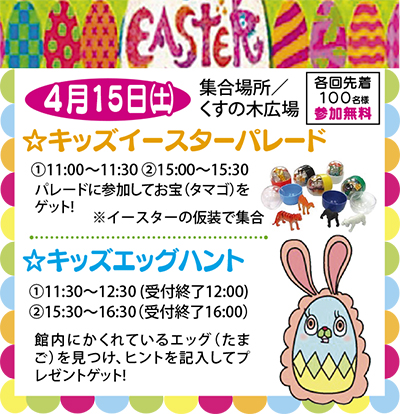 15日(土)には、くすの木広場にイースターの仮装をして集合する「キッズイースターパレード」、館内にかくれたエッグを見つける「キッズエッグハント」の2大イベント! お子様は参加してプレゼントゲットを。