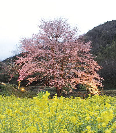 「あまりに奇麗だったので、ぜひ多くの方にも楽しんでもらいたいと思った」と話す猪股さん。桜は公開しており、敷地内には自由に出入りができる。8日には6分まで開花。隣りに広がる菜の花畑も見頃を迎えており、訪れた人はピンク色と黄色の景色を楽しんでいた。日没から19時まではライトアップも行われている。期間は16日(日)まで(予定)。