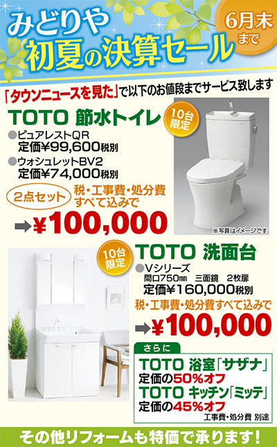パッキン1枚の交換から住宅総合リフォームまで、暮らしを支える(株)みどりや(露木徳英社長)では6月末まで決算セールを開催。