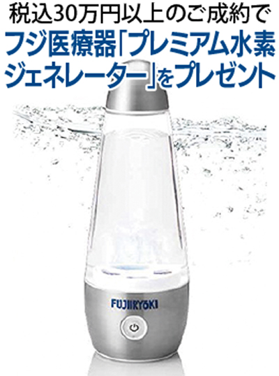 さらにTOTOの浴室「サザナ」が定価の50%オフ、TOTOのキッチン「ミッテ」が定価の45%オフとこちらもお得(工事費・処分費 別途)。税込30万円以上のご成約で、今話題の水素水をボタン1つで生成できるフジ医療器「プレミアム水素ジェネレーター」をプレゼント。