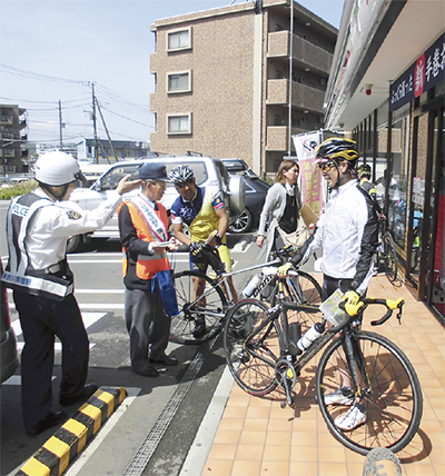ヤビツ峠自転車マナーアップキャンペーンが5月2日、名古木交差点のセブンイレブン秦野落合北店周辺で行われた。これは秦野市交通安全対策協議会が実施したもので、ヤビツ峠ヒルクライム計測の出発点近くとなっている同店にサイクリストが多く集まることから、同店協力のもと行われた。当日は関係者ら約20人が参加。「下り坂でのスピード出しすぎ注意」などと書かれた注意喚起のチラシや啓発物をサイクリスト約100人に配布し、マナーアップを呼びかけた。