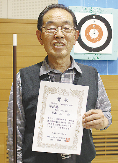 吹矢で的を狙い点数を競うニュースポーツ、スポーツ吹矢。第15回神奈川県大会(主催/神奈川県スポーツ吹矢協会)が5月12日にひらつかサン・ライフアリーナで開催され、秦野たんぽぽ支部に所属する梶山建一さん(74)が10m男子の部で準優勝に輝いた。