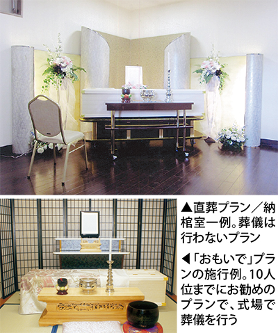 同斎場によると、最近「身内だけで静かに見送りたい」と家族葬や直葬の相談が増えているという。「10人くらいまでのご葬儀でしたら、『おもいで』プランをお勧めしています。当斎場の式場で行うご葬儀です」とスタッフ。そのほか、葬儀を行わない「直葬プラン」は、病院から同斎場に搬送後、式場で納棺するプラン。自宅へ直接搬送し、自宅出棺も可能だという。