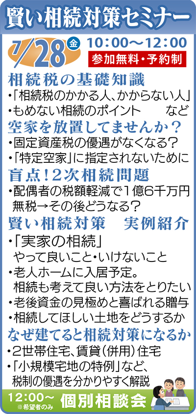 セミナーでは相続の基礎知識を分かりやすく解説するほか「子どもが独立して夫婦2人では広すぎる自宅」「財産のほとんどが不動産。どう分ける?」など、身近な実例を取り上げ対策を多数紹介。さらに老後資金の見極めや確保をした上での喜ばれる相続対策(生前贈与など)や賃貸(併用)住宅等を建てると相続税や固定資産税が大幅に軽減される仕組みも説明。役立つ情報が満載なのでぜひ参加を。
