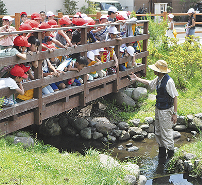秦野市立南小学校の2年生児童167人が7月3日、生活の授業「どきどきわくわくまちたんけん」を行った。今回は、学校の近くにある今泉あらい湧水公園の成り立ちなどを学ぶため、児童らは2グループに分かれて同公園まで移動。公園整備に関わった「秦野駅南部(今泉荒井)土地区画整理組合」の理事長を務めた地元の三杉克篤さんが話をした。