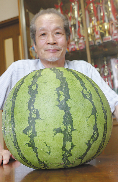 秦野市曽屋の富永英雄さん(69)の自宅で、ブロック塀に囲まれた小さな花壇から周囲90cm、重さ12・5kgのスイカが収穫された。