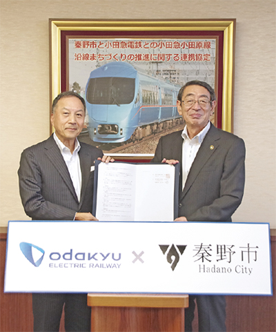 秦野市と小田急電鉄(株)は8月23日、「小田急小田原線沿線まちづくりの推進に関する連携協定」を締結した。市内にある4駅を対象に、駅を中心にしたまちづくり「コンパクト・プラス・ネットワーク」の実現や秦野市の魅力発信に向けて連携・協力をして進めていく。