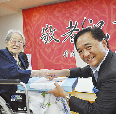 老人の日・老人週間を迎えるにあたり9月11日、黒岩祐治神奈川県知事が社会福祉法人むつみ福祉会 寿湘ヶ丘老人ホーム(加藤珠江理事長・千村497の1)を訪問し、入所者の長寿を祝って記念品を贈呈した。秦野市への訪問は初。
