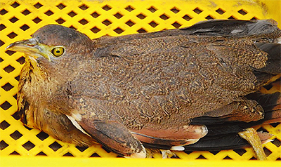 関野さんは保護した時の様子について、「畑の中でじっと動かなかったので近づくとくちばしを開けて威嚇してきた。コンテナをかぶせて保護したら少し落ち着いたようだった」と話す。