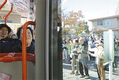 朝から地元の商店や自治会の人、市の職員などが鶴巻温泉駅前広場に集まった。帰りに鶴巻へ立ち寄ってもらおうと乗客には駅周辺の観光ガイドとタオルが配られ、袋には芳甘果の甘納豆も入っていた。始発は9時過ぎに出発。窓の外から多くの人が手を振って見送ってくれた。