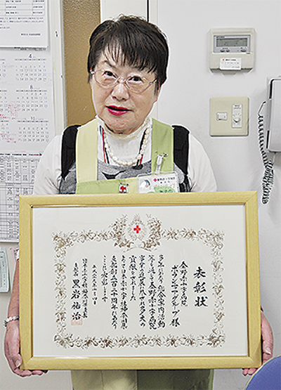 秦野赤十字病院で来院者や入院患者のサポート等を行っている同病院ボランティアグループ(天野陽子代表)に、日本赤十字社神奈川県支部(黒岩祐治支部長)から支部長特別表彰が贈られた。