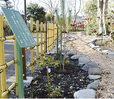 東田原の市指定の史跡「源実朝公御首塚(みなもとのさねともこうみしるしづか)」敷地内にこのほど、住民手作りの「波多野金槐植物苑」がお目見えした。