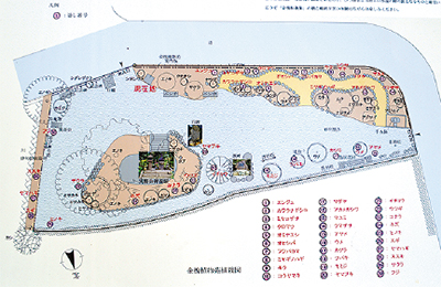 県立フラワーセンター大船植物園で同様に金槐和歌集の植物を紹介している例を参考にした。植物や看板等は専門業者に依頼し、11月初旬に約10人が参加して2日がかりで御首塚を囲む形の植物苑を整えた。