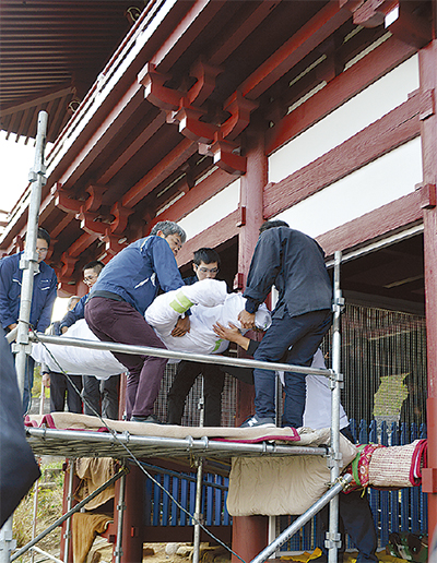 この日は寺関係者や地元住民らも見守るなかで、修復に携わった仏師の青木定雲さんも滋賀県から駆け付けた。最初に台座が運び入れられ、続いて白い布に覆われた仁王像が木枠(みこし)に寝かされた。木枠は数名がかりで慎重に運ばれ、仁王門に組まれていた足場を使い中に入れた後に台座に設置され、仏師により整えられた。