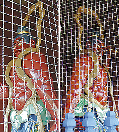 天台宗医王山東光寺(秦野市南矢名366、樋口亮順住職)の薬師堂で12月1日、修復された2体の金剛力士像が真新しくなった仁王門に安置された。