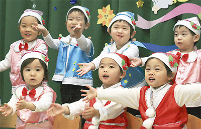 12月、秦野市内の幼稚園や保育園などでクリスマス会が開かれる中、秦野市渋沢のこひつじ保育園(守屋和子園長)では12月14日と16日にクリスマス発表会が行われた。14日は園を運営する社会福祉法人こひつじ愛児会の役員ら地域の人々の前で、16日は保護者の前で、園児たちがクリスマスにちなんだ歌や合奏、お遊戯などを披露。「めりーくりちゅます!」とたどたどしい口調で一生懸命に歌う園児の姿を見て、観客からは柔らかな笑みがこぼれた。また4・5歳児は舞踊劇「ピーターパンのぼうけん物語」を40分に渡って熱演。一人で複数の役をこなす園児もおり、観客の大人たちは感心しながら見守っていた。