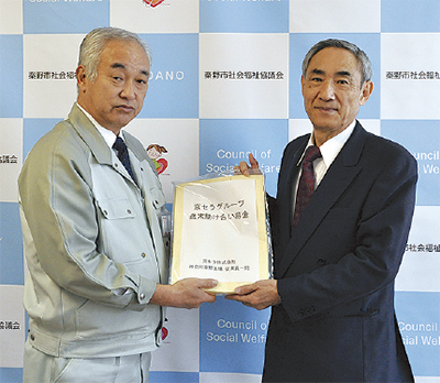 同社秦野工場の西原佳昭工場長は「従業員から募ったものです。助けを必要としている人に役立てて下さい」と同福祉協議会の藤村和靜会長に寄付金を手渡した。「気持ちに添えるよう役立てます。ありがとうございます」と藤村会長は感謝した。