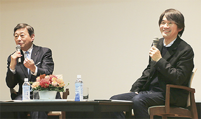第1部では月刊誌『ソトコト』(木楽舎)の指出一正編集長がゲストとして招かれ、山田清志学長と基調対談を行った。指出編集長は全国各地で目にした地域の素晴らしさやユニークな取り組みを紹介し、「住民でなくても地域と関わり、盛り上げる手伝いをしている人がいる。やりたいことをやった方がいい」と学生にエールを送った。