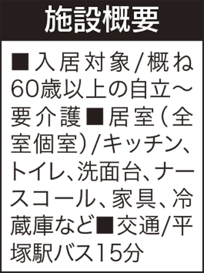 介護付軽費老人ホーム「ケアハウス湘南の里」(平塚市)は、入居者の健康ステージに応じ、元気なシニアにはプライバシーと利便性に配慮した必要最小限の生活サービス、要介護者には手厚い介護を提供する。