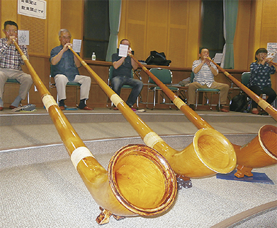 長さ3m40cm、重さは約4kgのアルプホルンは、約10カ月かけ会員自らが製作したものだ。アルプホルンの魅力を聞くと皆「音色」と即答。やさしい響きがなんともいえないと口を揃える。でも「最初は音が出ずに苦労した」と笑う。豊島さんは「皆一生懸命練習している。本番では良い演奏が披露できる」と話す。