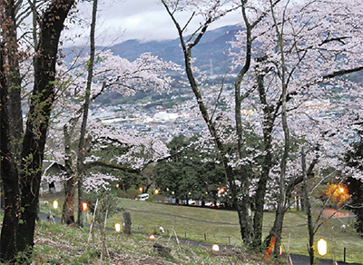 弘法山では4月に入り桜が満開を迎え、色とりどりの提灯が桜まつりの日に向けて夜桜を照らしている。