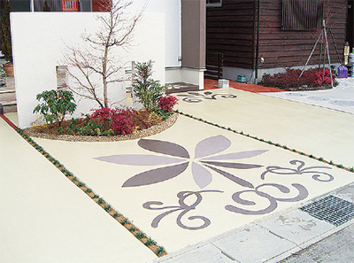 今ある地面や壁面、階段などの汚れを除去した上で直接舗装するため、短期間で仕上がり自由にデザインできるのが魅力。耐久性も高く、滑り止め効果もあるため用途も広い。ワンポイントの舗装も可能で愛車に合わせたカーポートへの施工依頼もあるという。