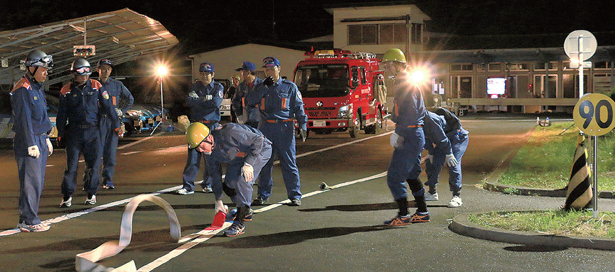 夜の自動車学校に消防団員の勇ましい掛け声が響く。
