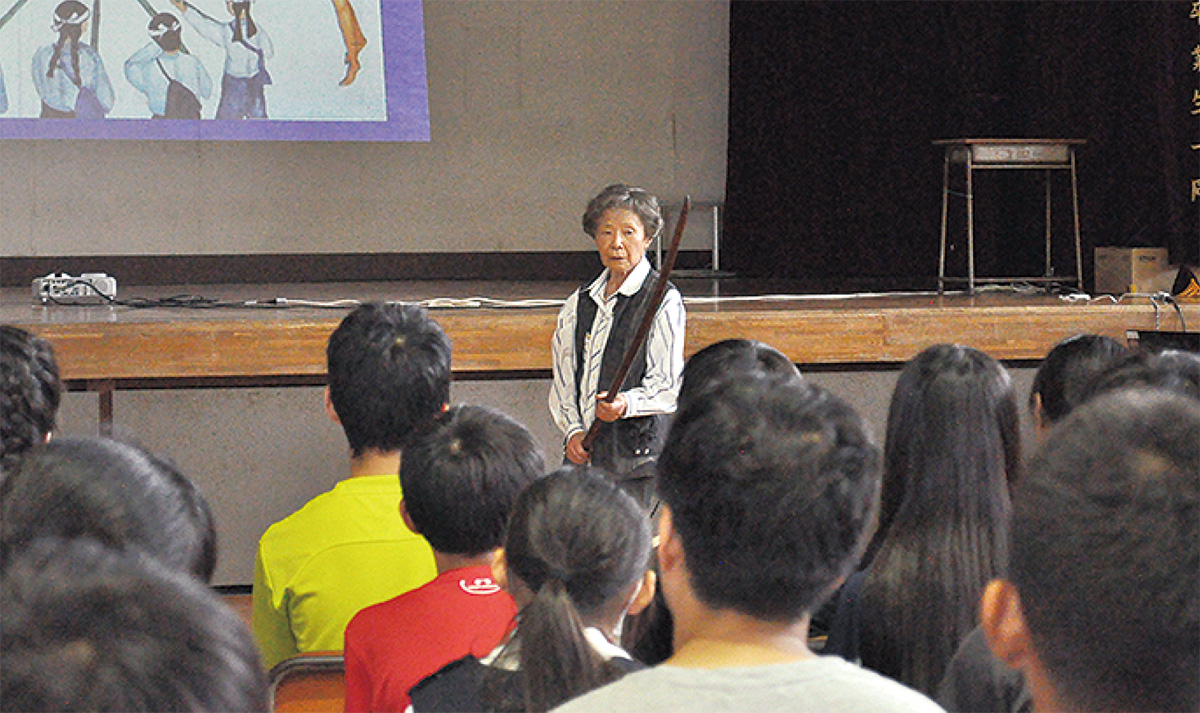 語り手を務めた山田知江さんは、学校の軍事訓練の際に使ったなぎなたを持参し、生徒たちの前で振って見せた。