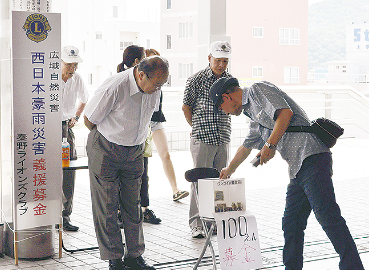 7月上旬に西日本で発生した豪雨災害の被災地支援のため、現在各地で募金活動が行われている。同LCでも一刻も早い支援を行おうと募金活動を実施。この日集まった26万2484円は被災地のLCに送られ、復興支援に充てられる。またライオンズクラブ国際財団からも、被災地支援として3300万円の基金が送られているという。