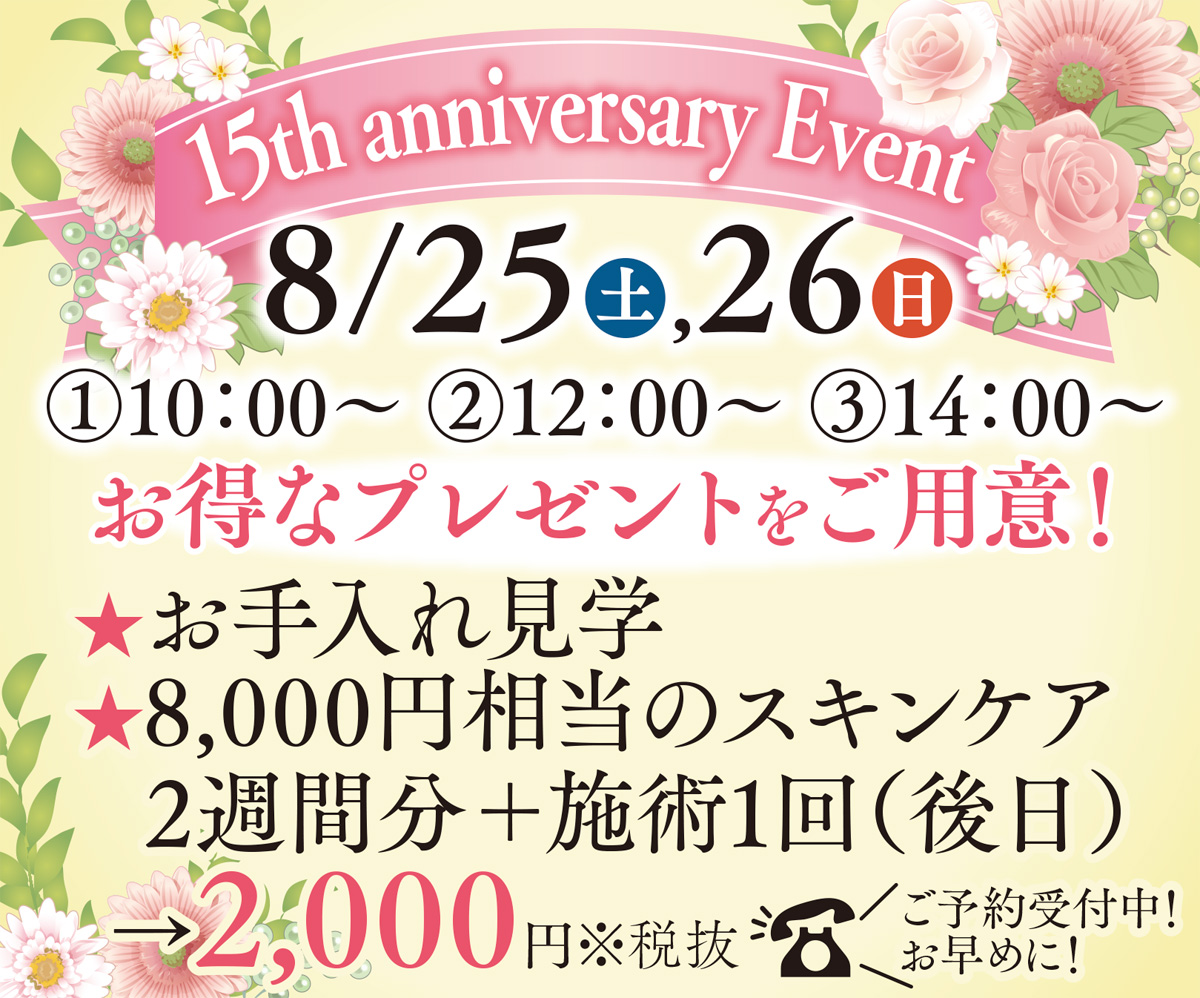 8月25日(土)、26日(日)には15周年記念イベントを開催。時間は両日10時、12時、14時の3回で来店の方に施術の見学とスキンケア2週間分(8000円相当)+施術(後日)を2000円(税抜)で体験できる特典つき。先着順の事前予約制。都合のつかない方は他の日も対応可。まずはお電話でご予約を。