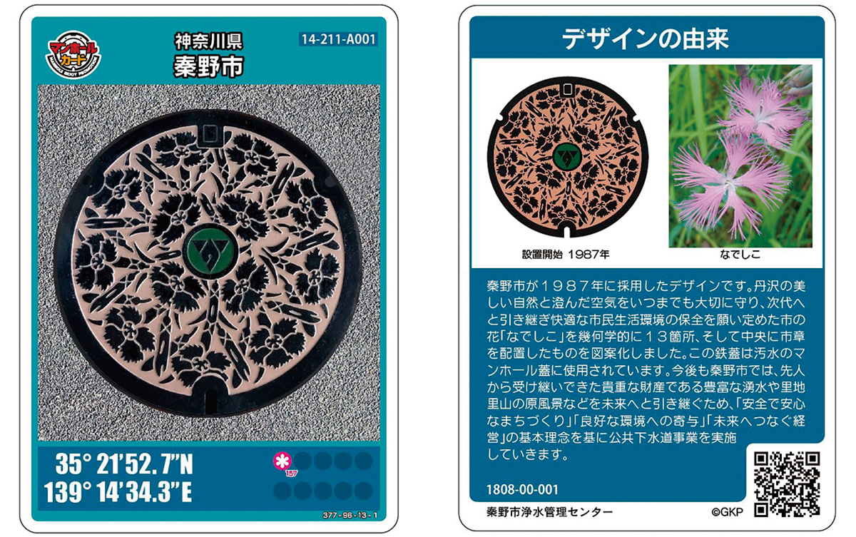 マンホールカードに採用された秦野市のデザインは、1987年から汚水のマンホール蓋に使用されているもので、市章を中央に、その周りに市の花「なでしこ」が幾何学的に13カ所配置されているもの。カードの表には都道府県市町村名、マンホール蓋の写真のほか位置座標などがあり、裏面にはデザイン図、デザインに関する画像や由来、説明などが書かれている。
