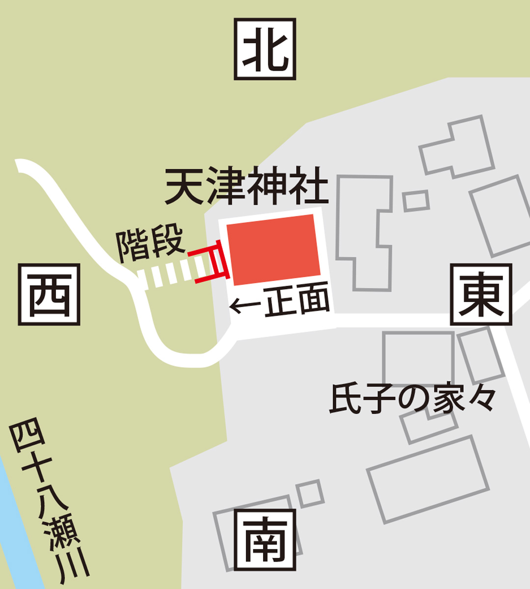 神社は一般的に南向きか東向きが多いという。しかし、天津(あまつ)神社(秦野市堀西766)はなぜか西向き。近所に住む岩田宇一さん(73)は、この謎に迫るため研究を重ね、一つの仮説を導き出した。