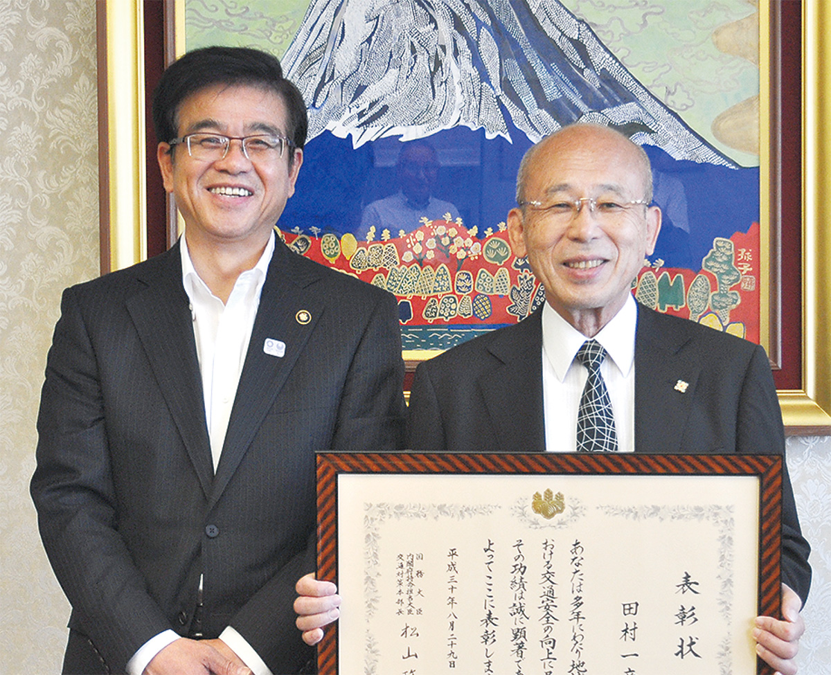 秦野市安全運転管理者会会長の田村一彦氏(73・府川電機工業(株)代表取締役社長)が内閣府の「交通安全功労者表彰」を受賞した。9月19日には田村氏が高橋昌和秦野市長を訪問し、受賞報告を行った。
