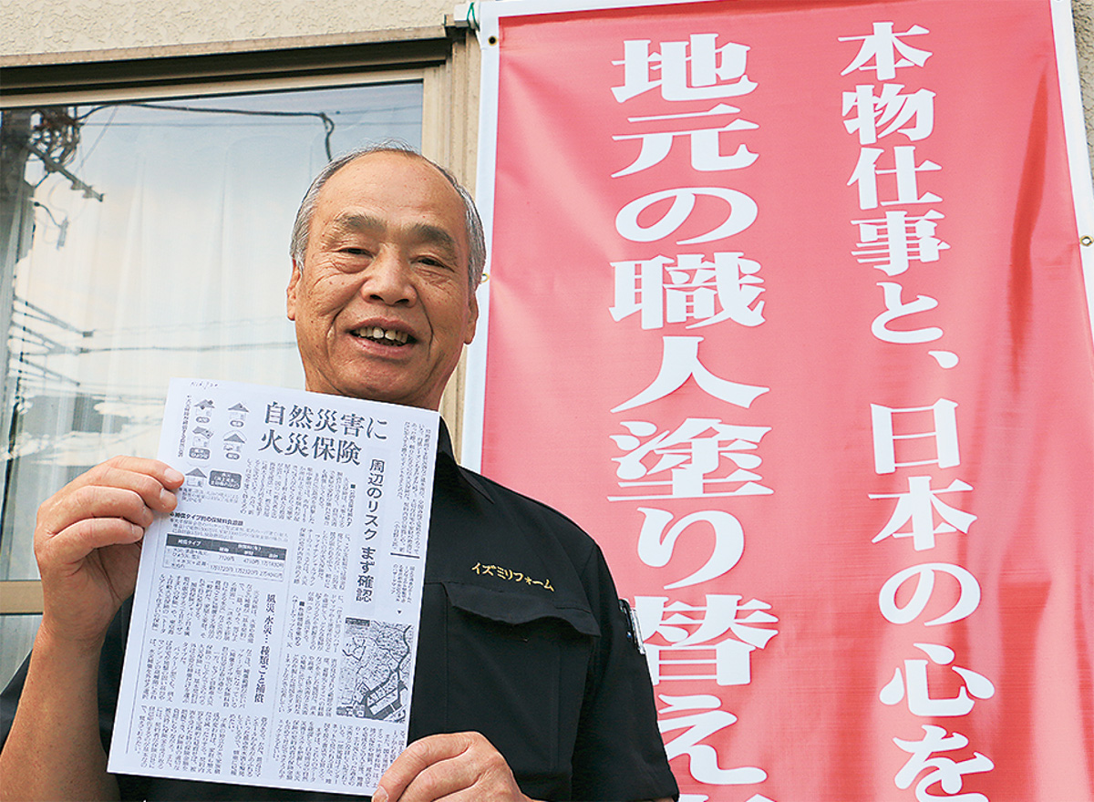 「自然災害で壊れた家屋の修理を火災保険で補償してもらえると知ると、皆さんとても喜ばれます」。そう力強く語るのはイズミリフォームの親方、大森三千男さん。「地域に根付いた本物の職人仕事でお客様の笑顔に包まれたい」と下請けを辞め創業22年。この道一筋の塗り替えリフォーム専門店として地域に愛されている。