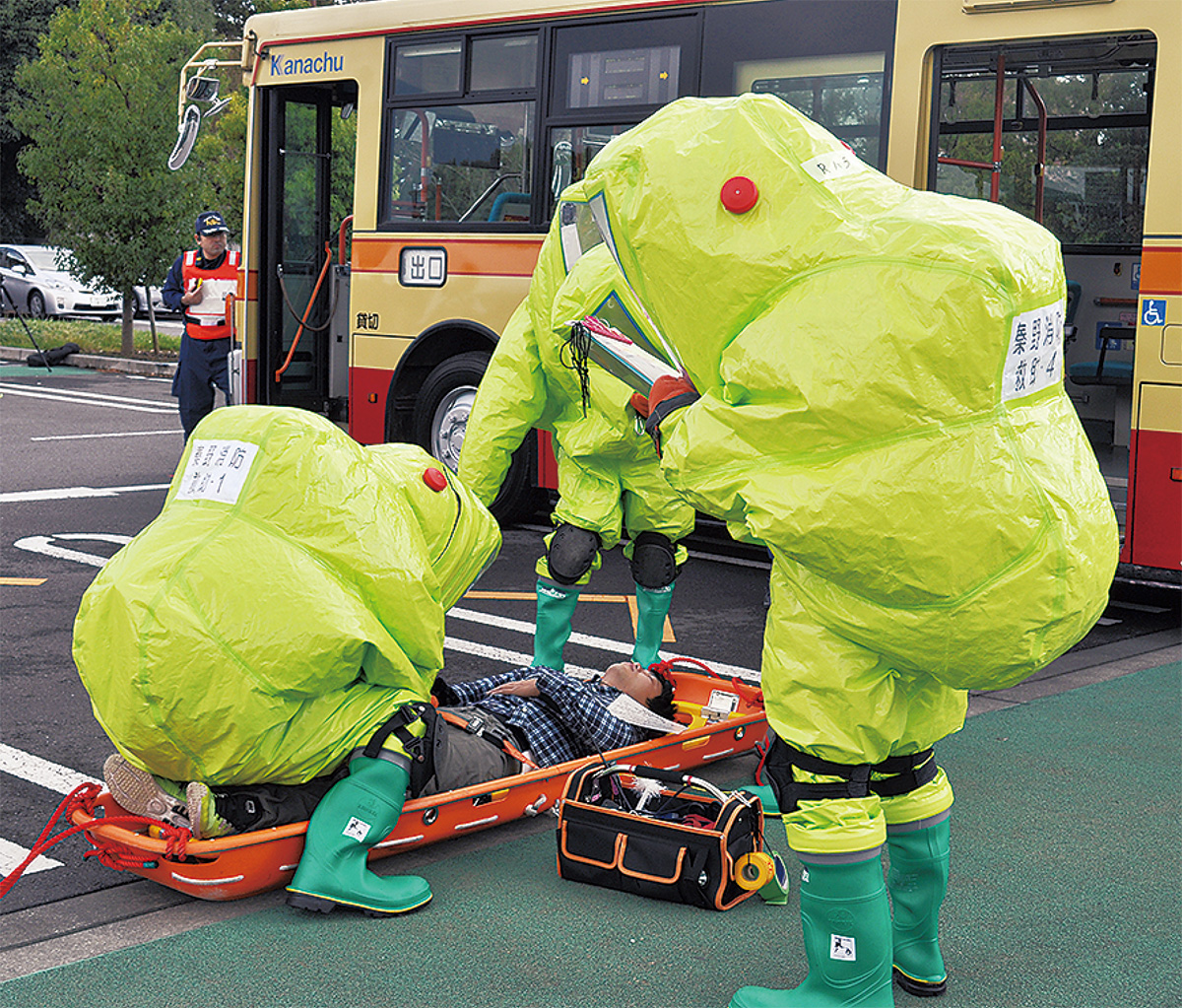 訓練には市消防本部を中心に、警察官や市役所職員、秦野赤十字病院救護班(HAMAT)、神奈川中央交通西(株)の社員など約100人が参加。オリンピック選手の練習場所である「県立山岳スポーツセンター」方面に向かうバスが走行中テロリストに占拠され、逮捕直前にバス車内に毒ガスを発生させたという事件を想定し、行われた。