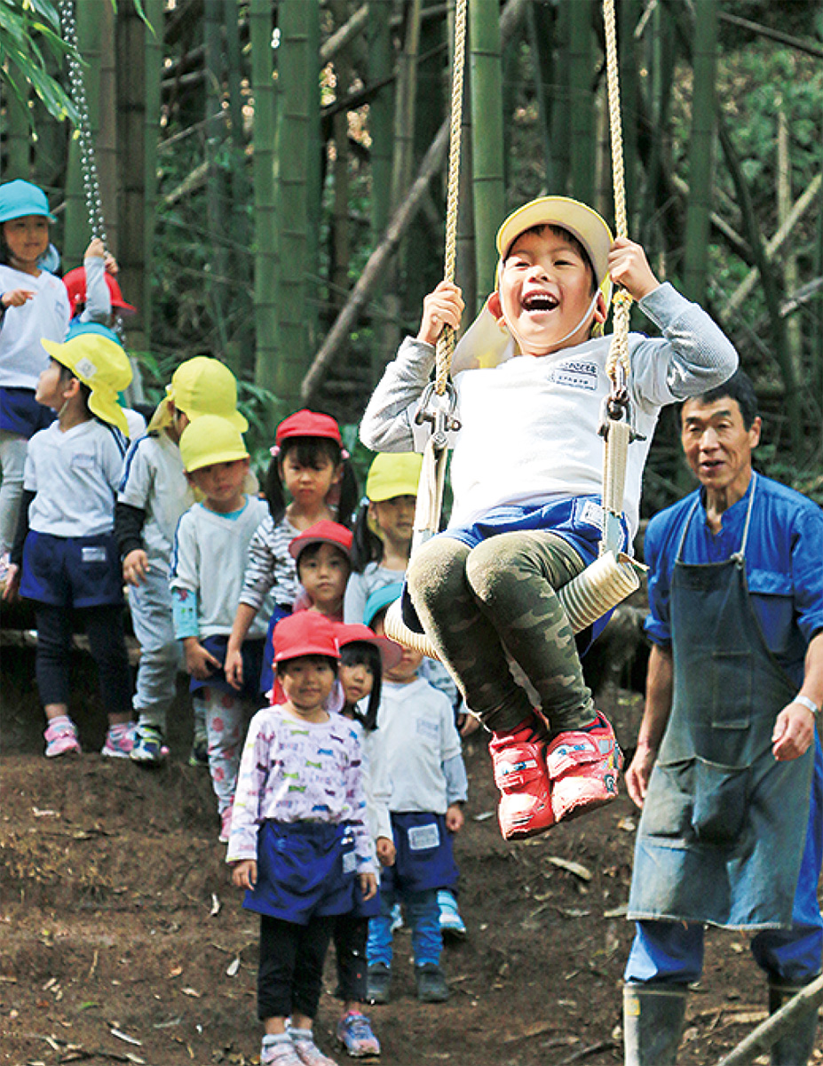毎朝、石や木の根で子どもがけがしないよう掃除を欠かさないという小野さん。「子どもの声が山の中にこだまするのは良い」と笑顔を浮かべた。