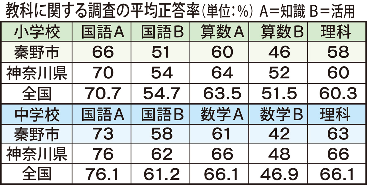 この調査は全国の小学6年生と中学3年生を対象に毎年行われている。秦野市ではこれまで同調査で正答率の平均が全国平均を上回ったことはない。今年も小中学校とも全教科で全国平均・神奈川県平均ともに下回った。