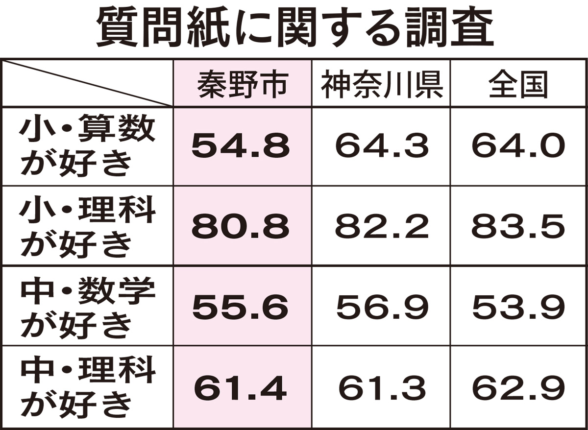 その一方質問紙による調査では、「数学が好き」と答えた割合が、2年連続して全国平均を超えるなど成果も上がる。市教育指導課では「現場の先生たちがより生徒にわかりやすいよう、工夫を凝らして授業を進めてくれている」と話す。