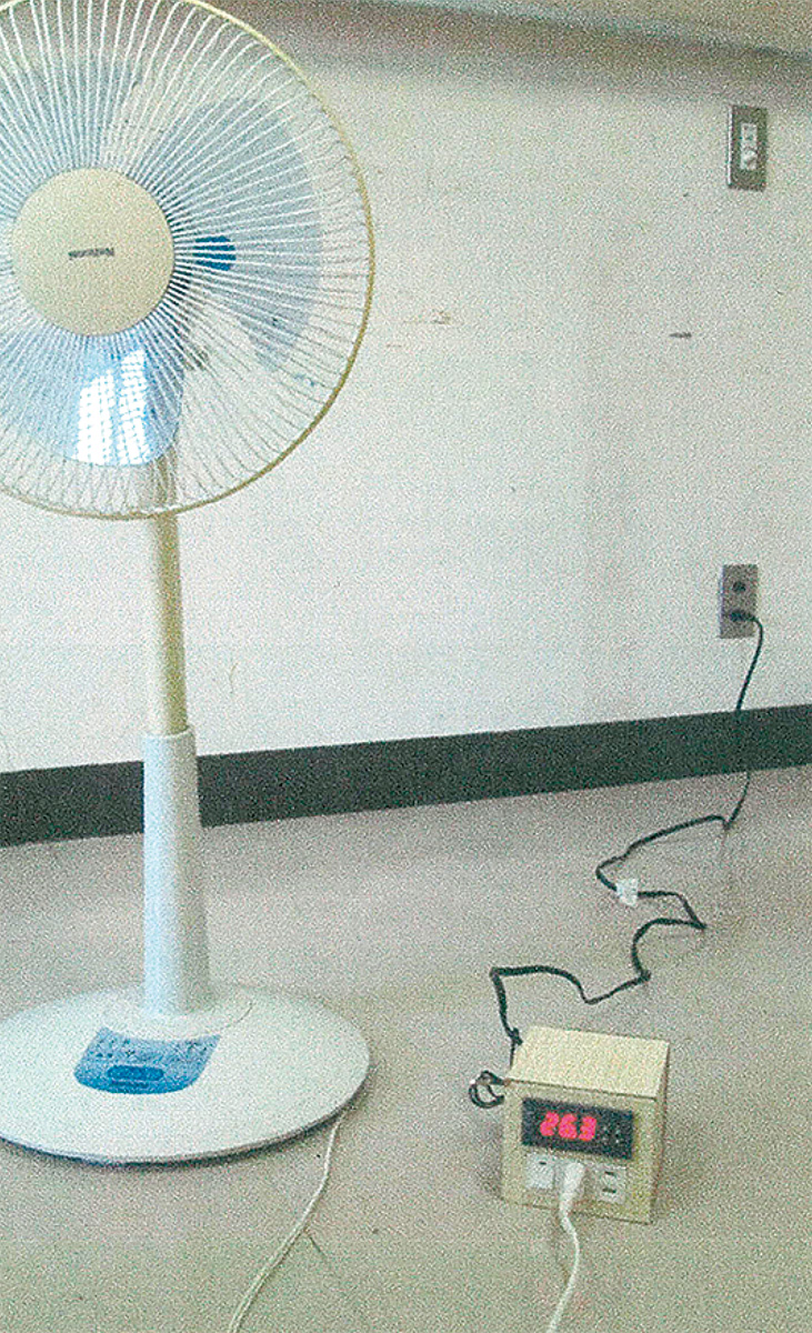 製作のきっかけは、猛暑日が続いた今年の夏休み。寝ている間に扇風機のタイマーが切れると暑くてたまらなかった事から「暑い時だけ電源が付けば快適だし、エコなのに」と構想を練り始めた。