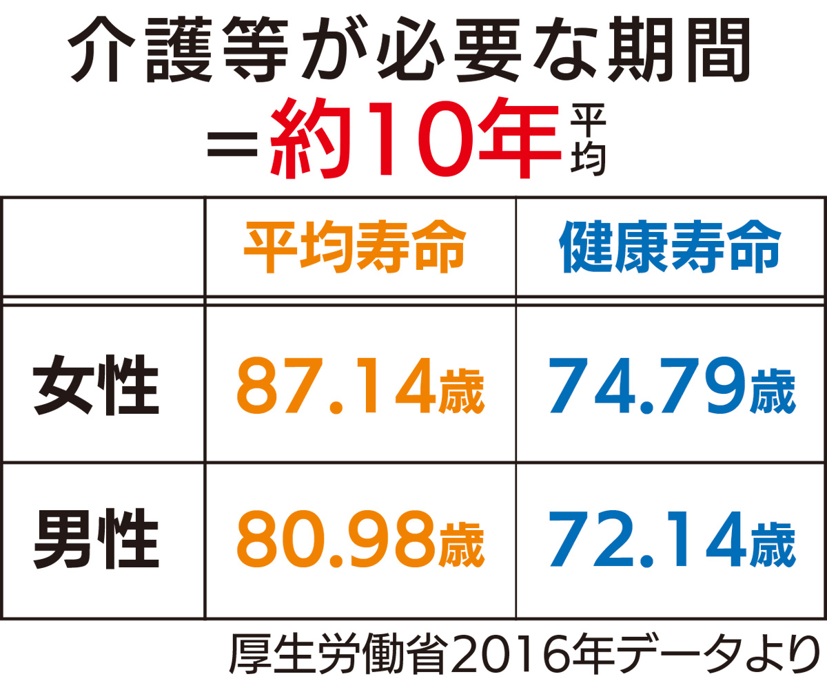 日本の平均寿命は現在、女性が87歳、男性が81歳と過去最高を更新しています。ところが、”健康寿命”は女性75歳、男性72歳。介護や支援を必要とする期間が平均で約10年と言われており、健康寿命を平均寿命に近づける事の必要性が叫ばれています。